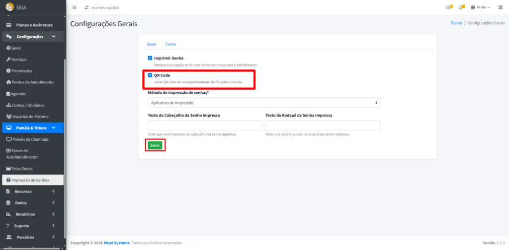 Antes de começar, é necessário habilitar a funcionalidade do QR code na plataforma. Para isso, basta acessar a área administrativa e, na barra lateral, abrir o menu lateral em Painéis & Totens >Impressão de senhas ou clique aqui para ir direto para tela.