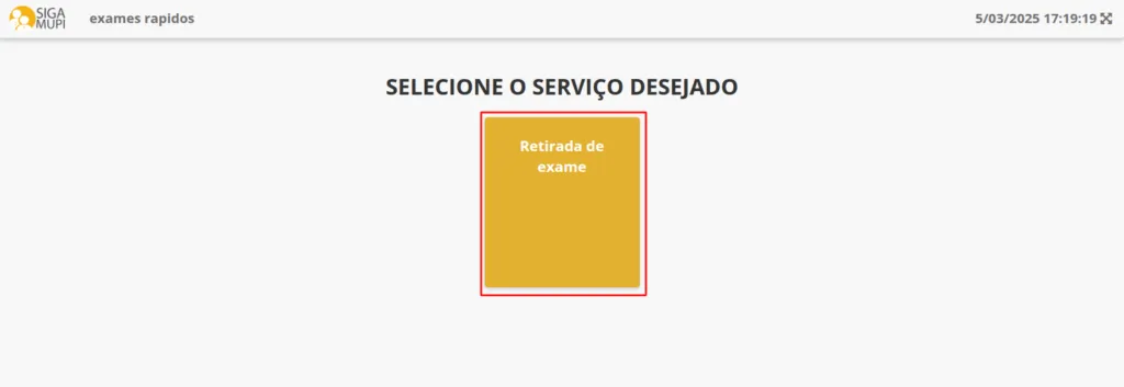O primeiro passo para permitir o acompanhamento de uma fila de espera é registrar a chegada da pessoa que será atendida. Para isso, vamos abrir a tela de seleção de senha em um terminal de autoatendimento. Partindo da tela inicial, clique no botão Seleção de Senha.