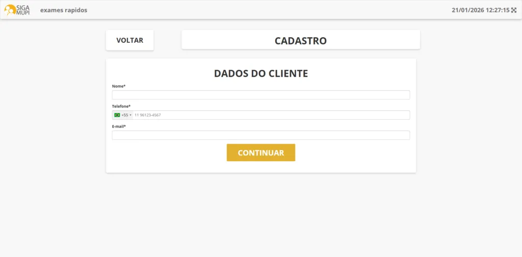 Se você configurou o sistema para pedir o cadastro do cliente pela tela de autoatendimento, o próximo passo consiste em preencher os campos com os dados da pessoa que será atendida. Contudo, lembre que você pode optar, na configuração, por eliminar essa etapa.