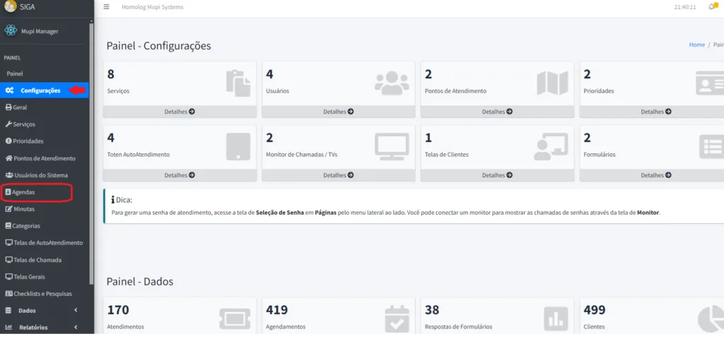 2. A página será redirecionada ao PAINEL – CONFIGURAÇÕES. Clique em CONFIGURAÇÕES → AGENDAS.
