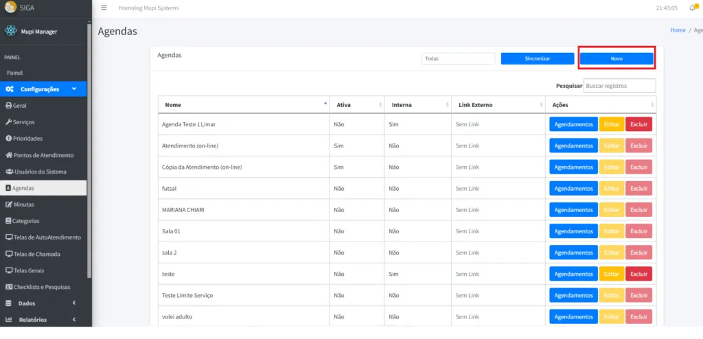 3. A página será redirecionada para Agendas, clique em NOVO.