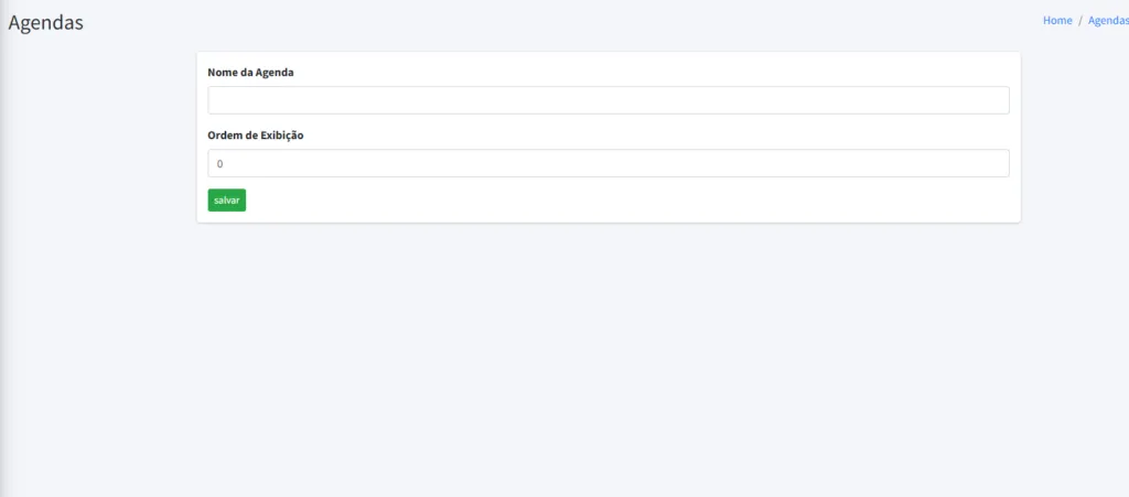 4. A página será redirecionada para AGENDAS. Em seguida, informe o nome da agenda a ser criada e qual será a sua ordem de exibição. Por fim clique em SALVAR.