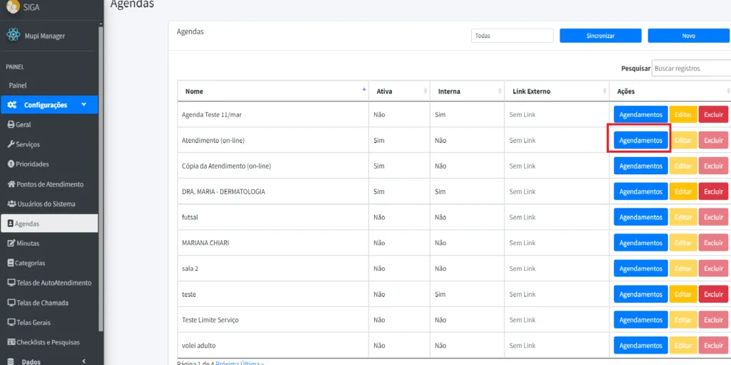 5. Para criar um agendamento, clique no botão AGENDAMENTOS, à direita da agenda pretendida.