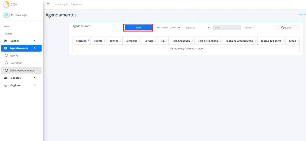 6. A página será redirecionada para AGENDAMENTOS, clique em NOVO.