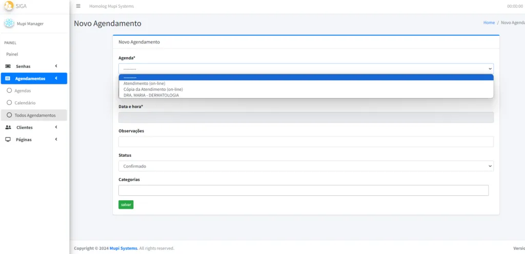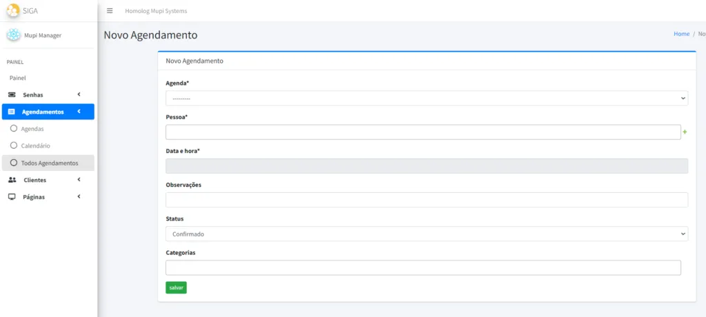 7. A página será redirecionada para NOVO AGENDAMENTO, preencha os campos e clique em SALVAR.