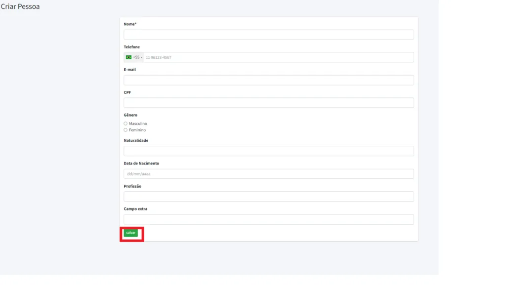 Será aberta uma janela para o preenchimento das informações cadastrais. Insira as informações desejadas e finalize clicando em Salvar.