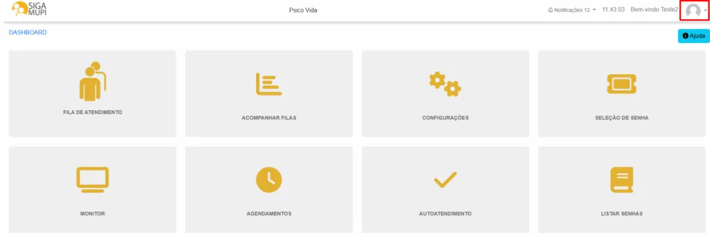 - Na Dashboard, no canto superior direito, localize o ícone de perfil (personagem) e clique sobre ele.