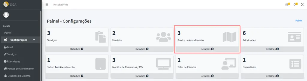 No Painel da sua organização acesse as configurações clicando em Detalhes no botão de Pontos de Atendimento, ou em Configurações no menu lateral e depois em Pontos de Atendimento.