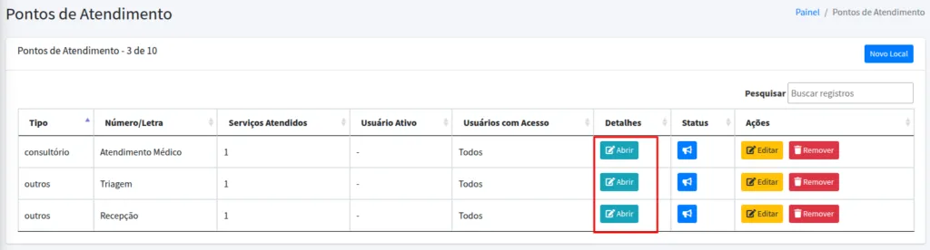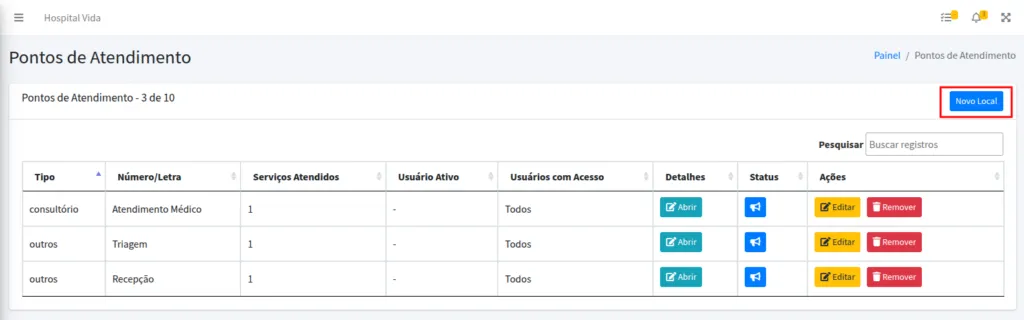 Na página seguinte você terá a relação dos pontos de atendimento cadastrados em sua organização. Você poderá editá-los, removê-los ou criar novos. Para criar, clique em Novo Local.