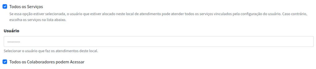 - Caso você selecione a opção Todos os Serviços, o usuário que estiver alocado naquele ponto de atendimento poderá exercer todos os serviços que estiverem vinculados a ele pela configuração do usuário.