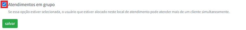 Por fim, você deve indicar se deseja habilitar a configuração de Atendimentos em grupo. Com essa opção selecionada é possível fazer a chamada de mais de uma senha simultaneamente, viabilizando o atendimento de vários clientes ao mesmo tempo.