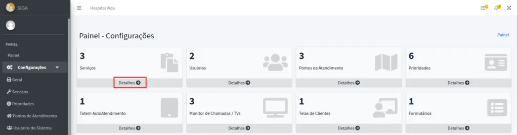 No Painel da sua organização, acesse as configurações de serviços clicando em Detalhes no botão de serviços, ou alternativamente em Configurações no menu lateral e depois em Serviços.