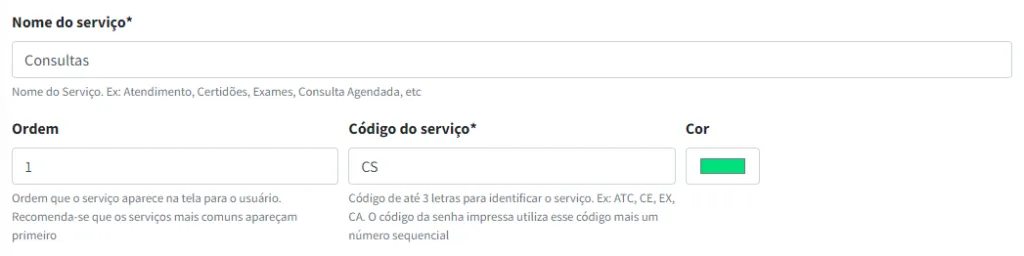 Observe que o campo Ordem deve ser preenchido conforme a posição em que você deseja que o serviço seja exibido na tela para o usuário. Por exemplo, o serviço Consultas será o primeiro na tela de seleção de senhas.