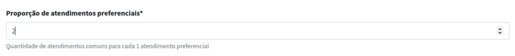 Em seguida, você deve indicar a proporção de atendimentos preferenciais em relação aos atendimentos comuns. Nesse exemplo, a cada duas senhas comuns será chamada uma senha preferencial.