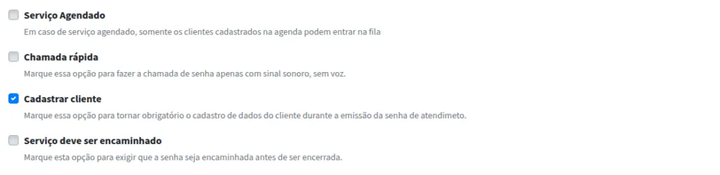 Caso você opte por Cadastrar cliente, você deverá indicar quais dados serão solicitados no momento da emissão de senha, conforme demonstrado abaixo.