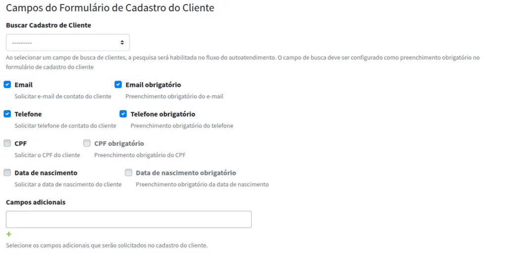 Observe que, além de indicar quais dados serão solicitados, você pode indicar se o preenchimento desses dados são obrigatórios ou não. Além disso, você pode configurar um Campo Adicionais, solicitando, por exemplo, o endereço da pessoa que será atendida.