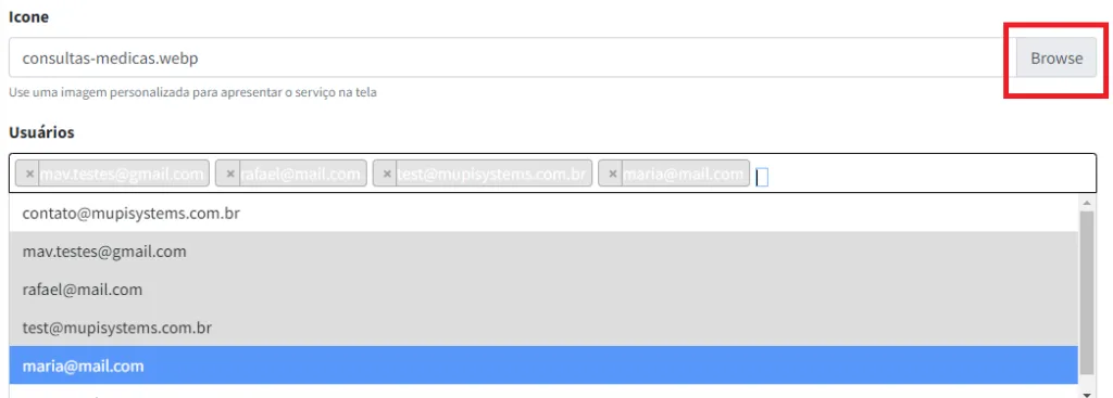 Em seguida, você poderá selecionar uma imagem personalizada para representar o serviço na tela de senhas. Para isso basta clicar em Browse e depois escolher o arquivo desejado. Além disso, você pode vincular os usuários que estarão habilitados a realizar os atendimentos desse serviço. Para isso, basta clicar na aba de usuários e selecionar os desejados.