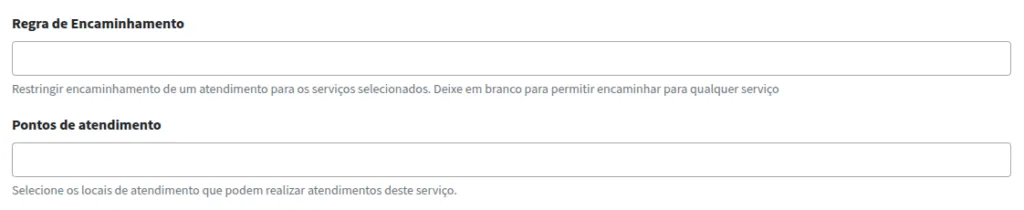 Em seguida, configure a Regra de Encaminhamento e os Pontos de Atendimento. Caso o campo da Regra de Encaminhamento seja deixado vazio, será permitido encaminhar para qualquer outro serviço. Para restringir o encaminhamento, basta definir o serviço específico desejado. No campo Ponto de Atendimento, especifique os locais que realizarão o atendimento do serviço.