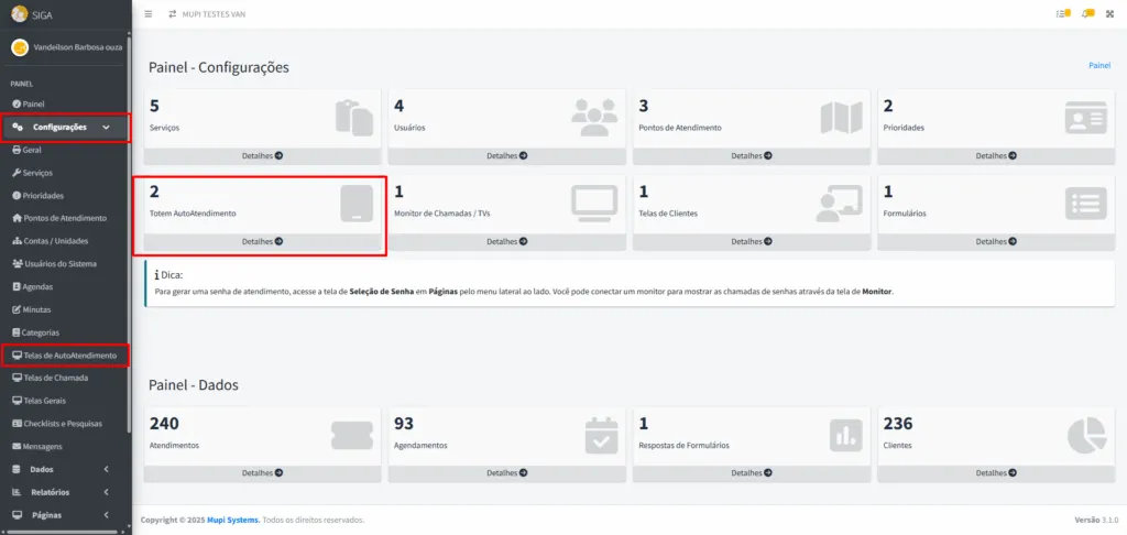 - Integração com serviços: Consulte o tutorial Como Configurar Serviços/Filas para garantir que os serviços exibidos nos totens estejam corretamente configurados.