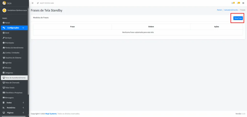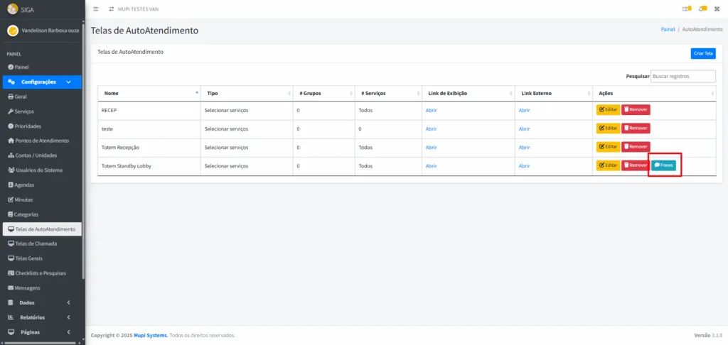 - Retorne à tela Telas de Autoatendimento, localize o totem standby criado e clique em Frases no canto direito.