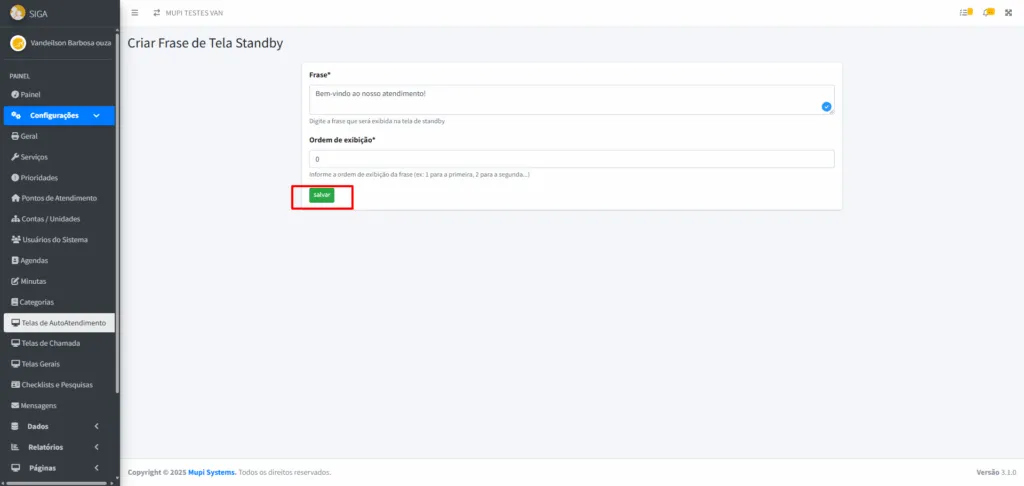 - Na seção de frases, clique em Adicionar Frase, insira frases (ex.: “Bem-vindo ao nosso atendimento!”) e defina a ordem de exibição.