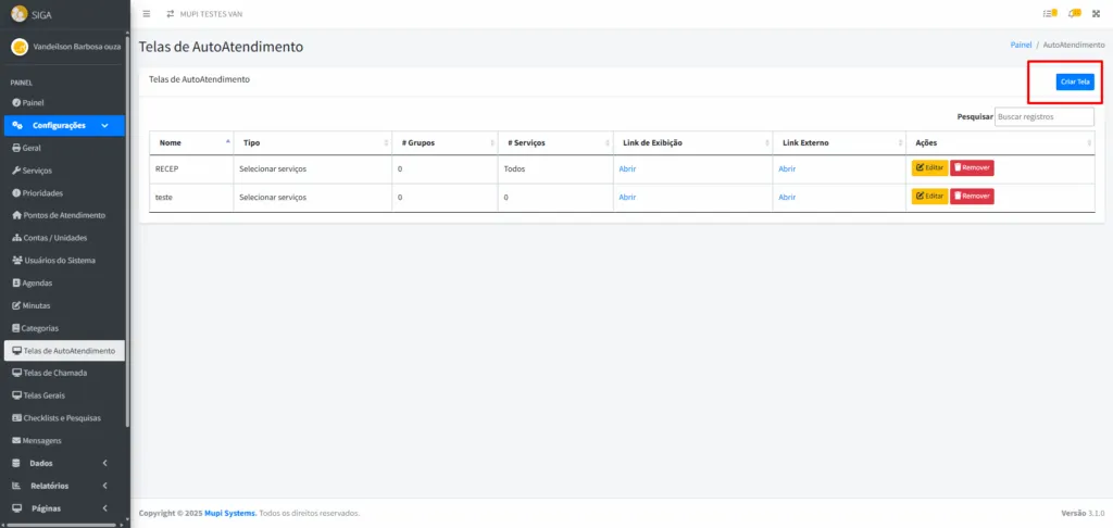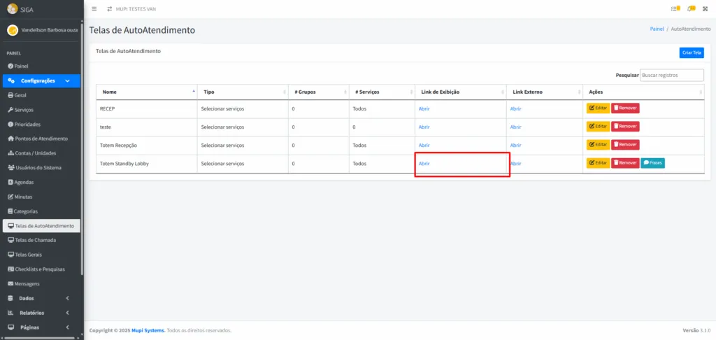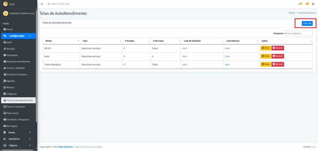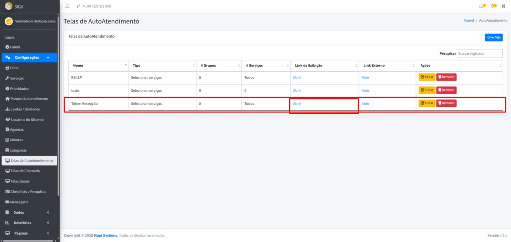 - Na tela Telas de Autoatendimento, visualize os totens já cadastrados.