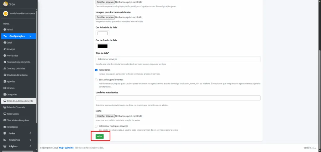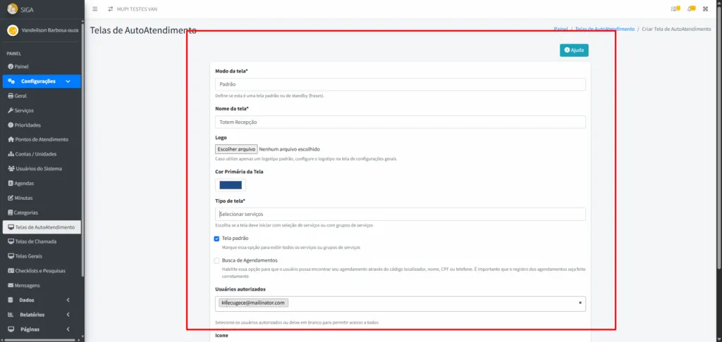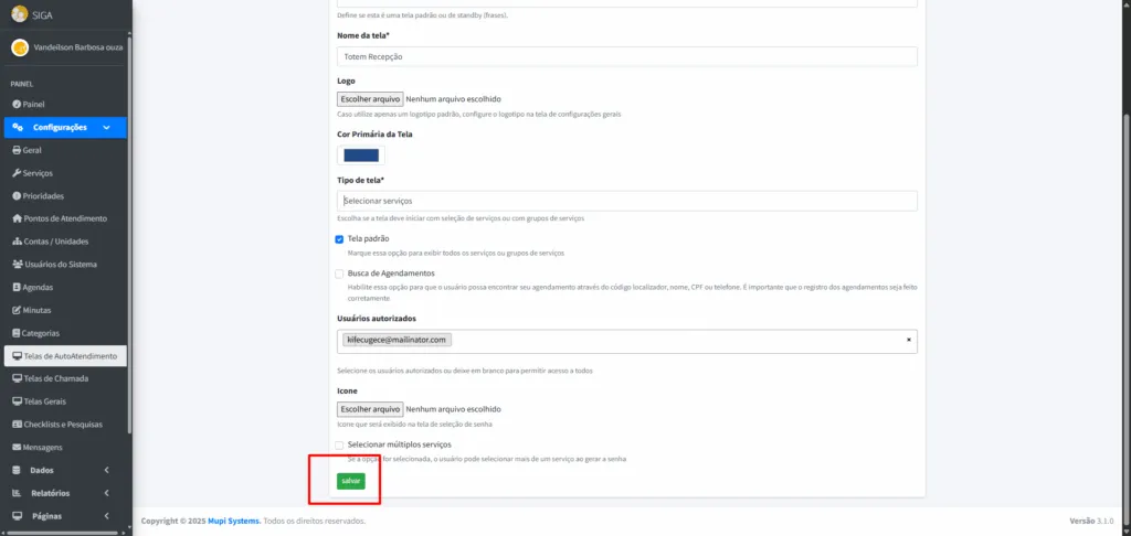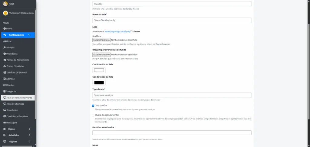 - Usuário Autorizado: Escolha um usuário para acessar a tela do totem (opcional).