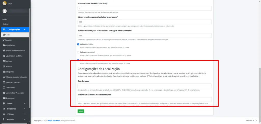 Após inserir as coordenadas e definir a distância máxima de atendimento, clique em Salvar para aplicar as configurações.
