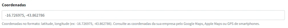 Coordenadas: O primeiro passo é definir a localização da sua empresa, para isso, insira as coordenadas no formato: latitude, longitude (exemplo: -16.726975, -43.862786).