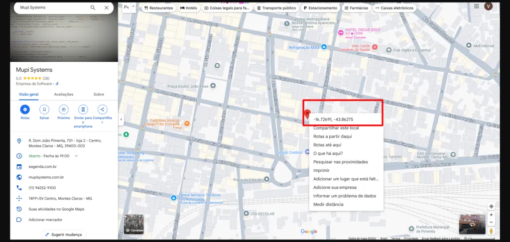- Google Maps: Pesquise o endereço da sua empresa e, ao encontrar o local, clique com o botão direito do mouse no ponto exato, em seguida só copiar as coordenadas exibidas. As coordenadas serão exibidas na parte inferior.