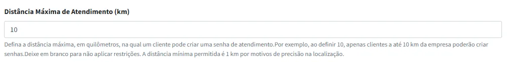 Distância Máxima de Atendimento (km): Neste campo, você define a distância máxima, em quilômetros, que um cliente pode estar da sua empresa para criar uma senha de atendimento.