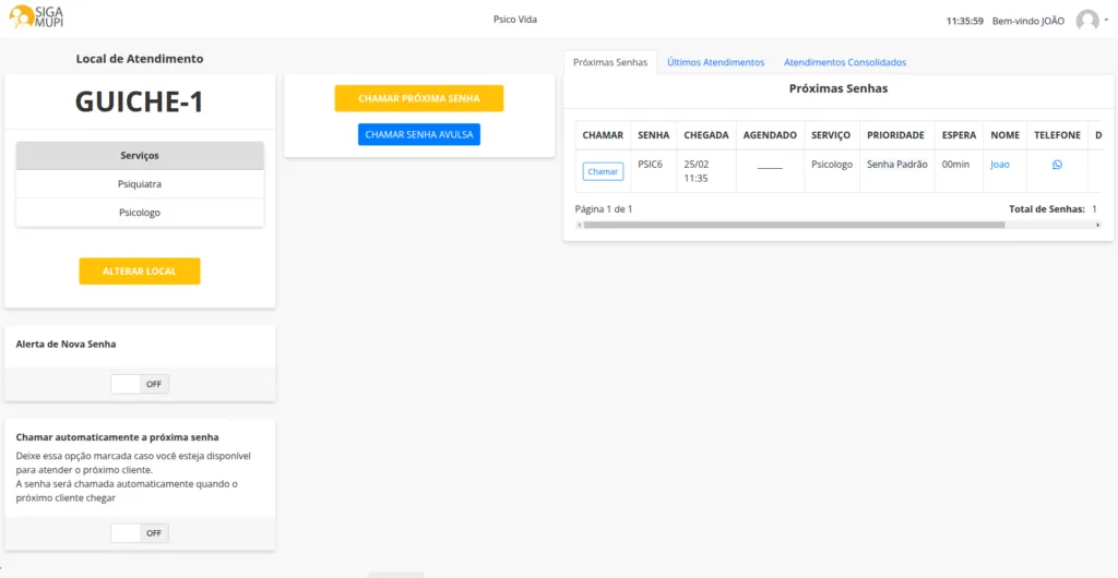 O cliente será notificado com sua senha, poderá acompanhar o status da fila por meio de um link e terá a opção de interagir diretamente via WhatsApp com o responsável pelo atendimento.