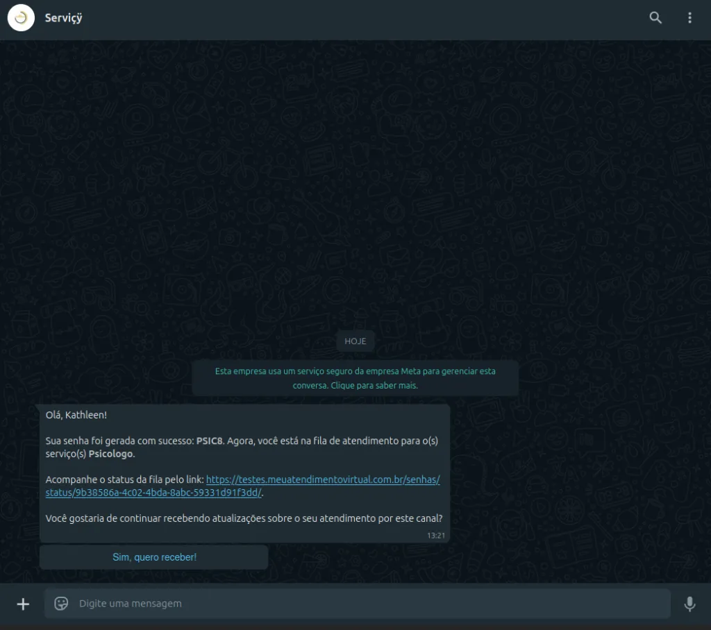 Após o cliente clicar em “Sim, quero receber”, as interações serão possiveis, note que no painel de chamada de senhas, você recebe alerta de notificação sempre que houver uma nova mensagem.