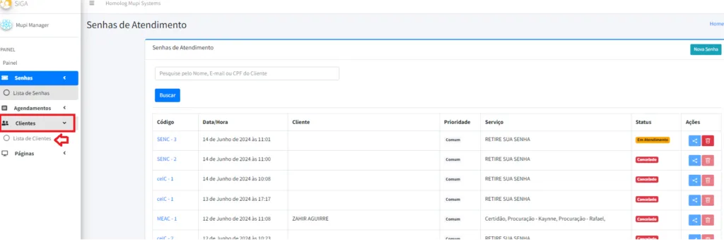 2. A página será redirecionada para **SENHAS DE ATENDIMENTO. No painel a esquerda clique em CLIENTES → LISTA DE CLIENTES.