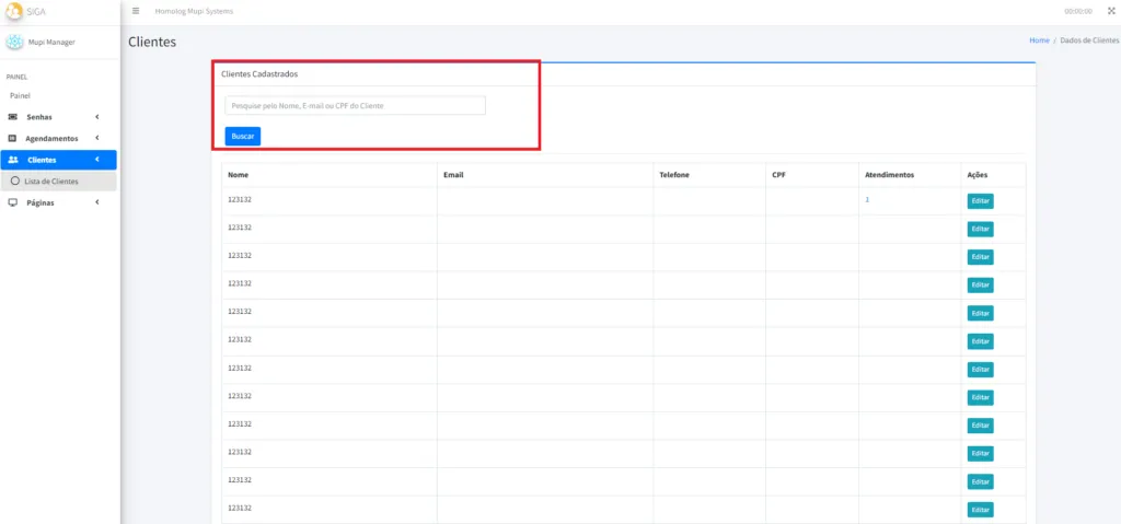 3. Ao clicar em LISTA DE CLIENTES a página será redirecionada para CLIENTES. Nessa página é possível pesquisar os clientes cadastrados pelo nome, número do CPF ou e-mail.