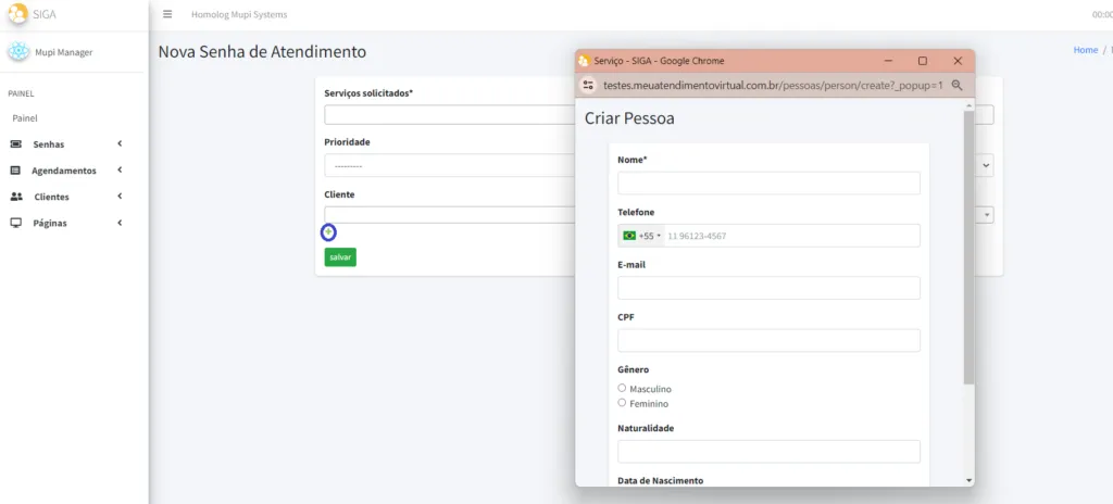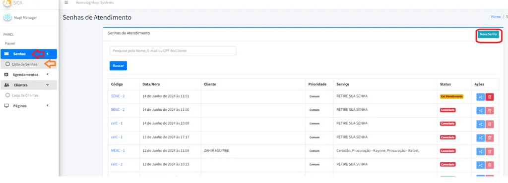 4. Para cadastrar um novo cliente, clique em SENHAS no painel a esquerda → LISTAR SENHAS → NOVA SENHA.