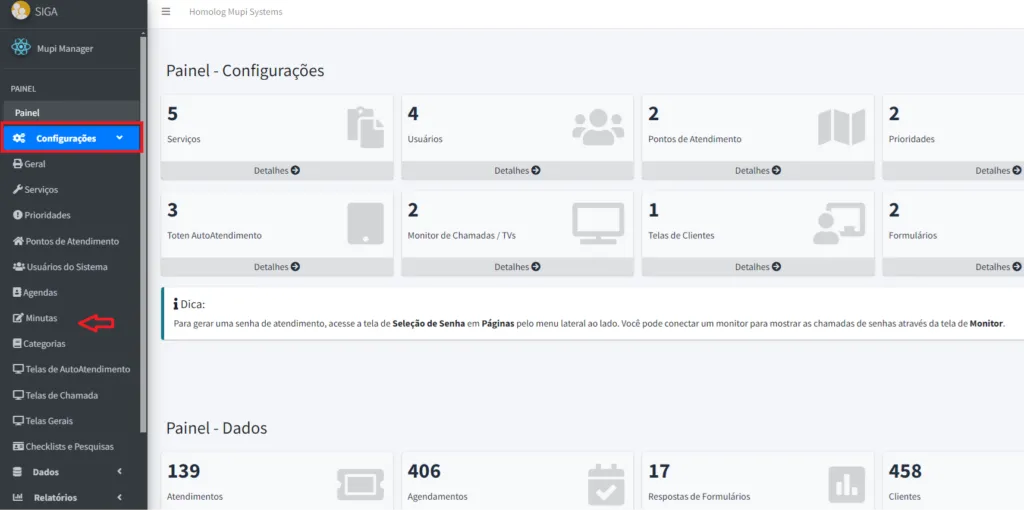 A página será redirecionada para o PAINEL DE CONFIGURAÇÕES. Clique em MINUTAS.