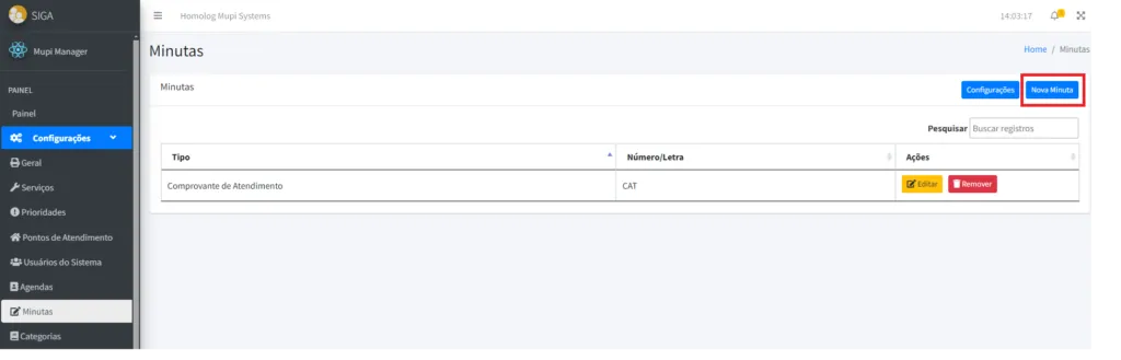A página será redirecionada para MINUTAS. Clique em NOVA MINUTA.
