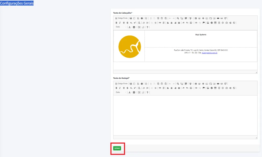 A página será redirecionada para Configurações Gerais. Crie o texto do cabeçalho e /ou Rodapé, adicione o logotipo e todas as informações que desejar. Por fim clique em GERAR.