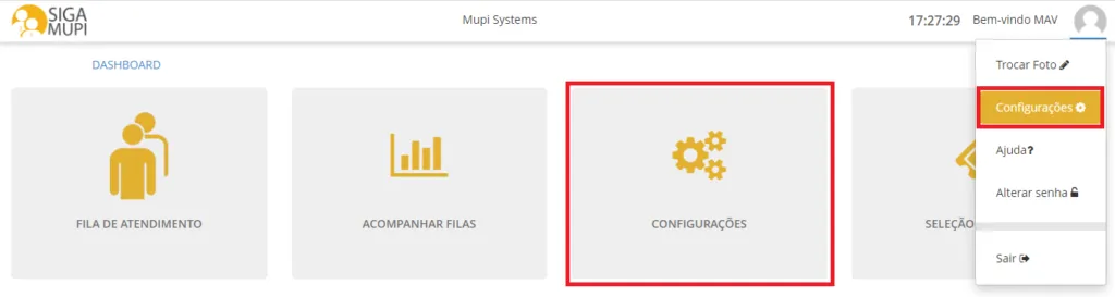 Depois de fazer login na plataforma, acesse o ícone de “Configurações” na Dashboard do sistema ou clique no ícone do seu usuário no canto superior direito da tela e depois em “Configurações”.