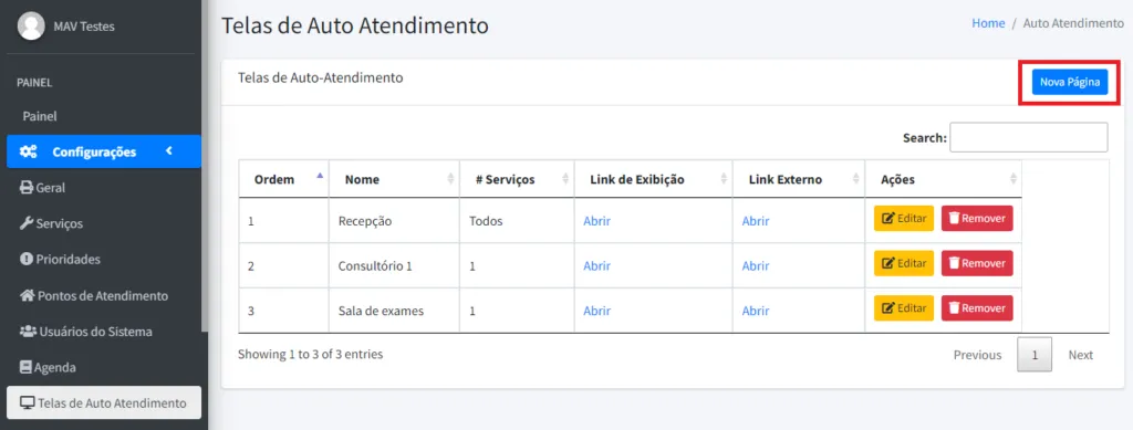 Na página seguinte você terá a relação das telas configuradas no sistema. Você poderá editá-las, removê-las ou criar novas telas. Para criar, clique em “Nova Página”.