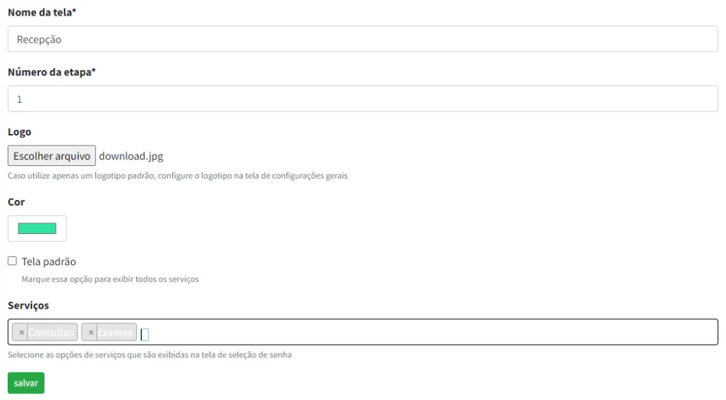 - Além disso, é necessário indicar quais serviços você deseja que sejam exibidos nessa tela: caso você clique em “Tela padrão” todos os serviços serão exibidos; caso contrário, você pode selecionar apenas os serviços desejados no campo específico.